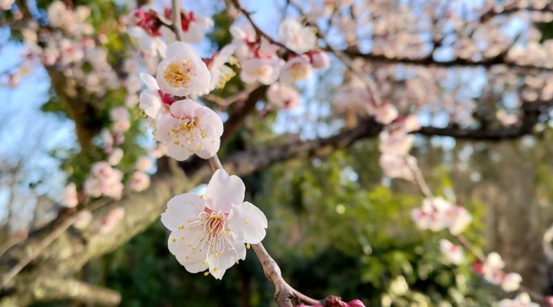 集会所横のしだれ梅や水仙の花が咲き乱れて