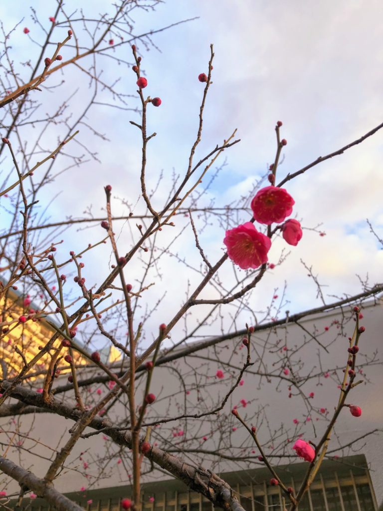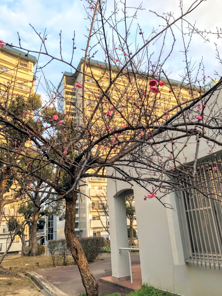 1月3日集会所前の一番早咲きの梅の花。季節をやわらいで春の到来を感じられます。
