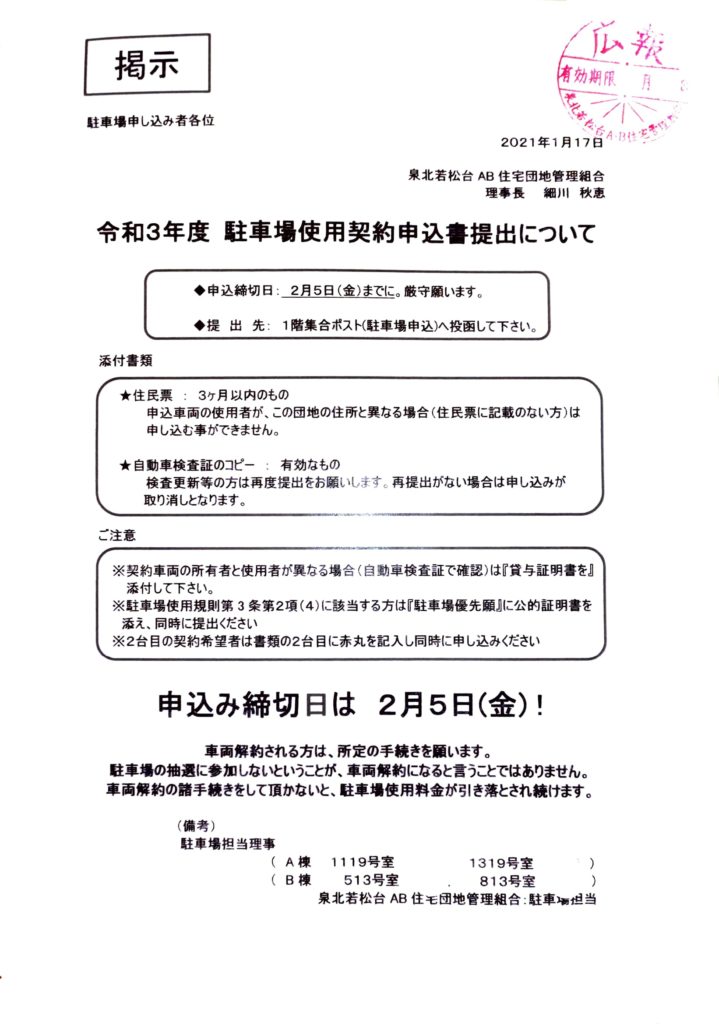 お知らせ 令和3年度駐車場使用契約申込書提出について 2021年1月19日 wakamatsuab ※優先区画をご希望の方は駐車場理事かフロア理事から申込書をお受け取り下さい。 ※1台目の車と2台目あるいは大型自動二輪と名義が同じ方は住民票は一部のみで結構です。