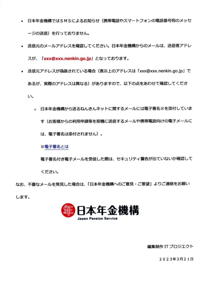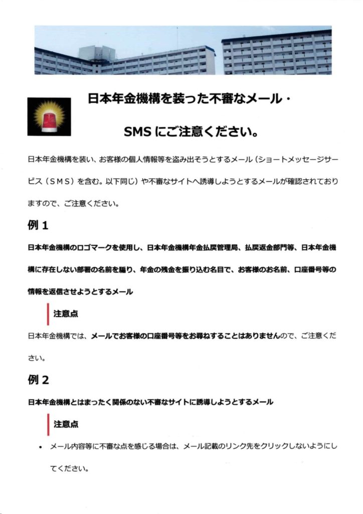 日本年金機構を装った不審なメール・SMSにご注意ください