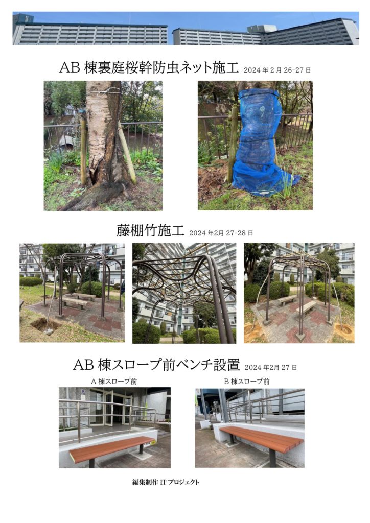 AB棟裏庭の桜幹防虫ネット施工