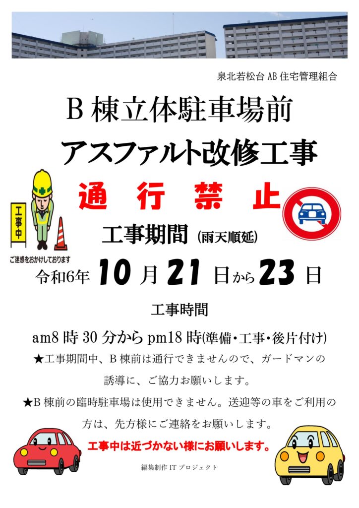 B棟立体駐車場前アスファルト改修工事 10月21日から23日通行止め
