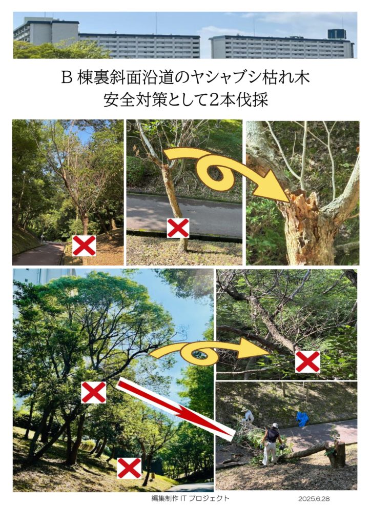 B棟裏斜面沿道のヤシャブシ枯れ木 安全対策として2本伐採