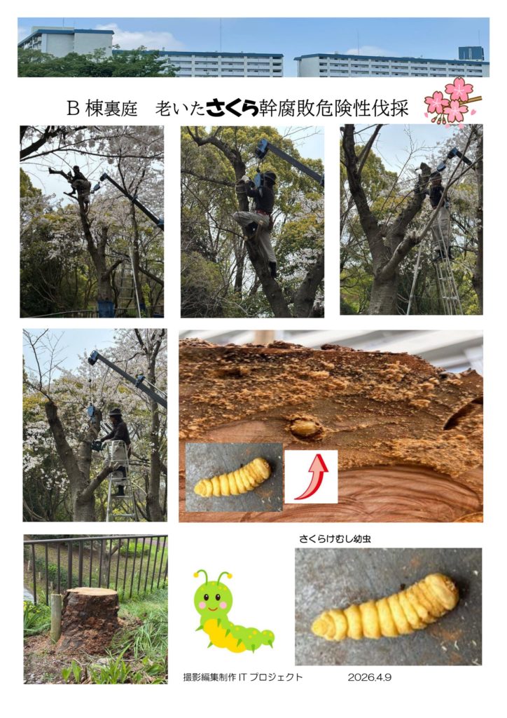 B棟裏庭 幹が腐敗した老いた桜の伐採作業