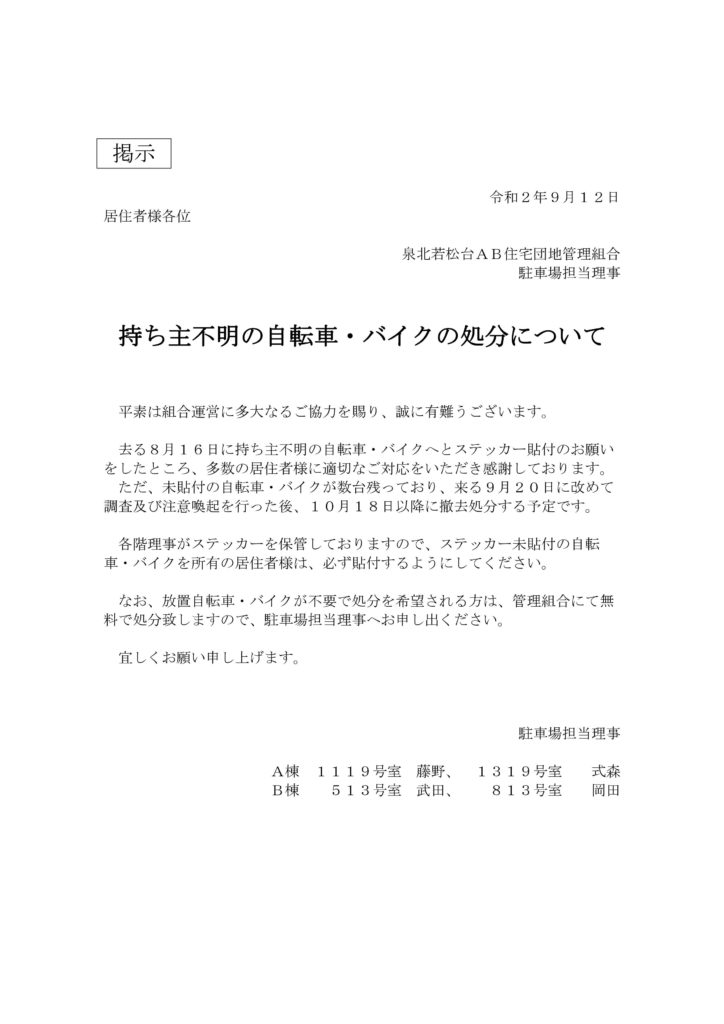 持ち主不明の自転車・バイクの処分について